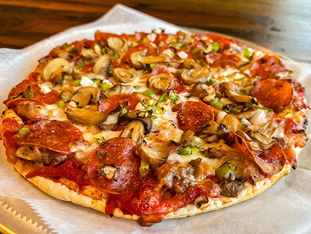 Hand-Crafted Pizza Sauce, Mozzarella Cheese, Beef, Pepperoni, Onions, Green Peppers, Mushrooms
